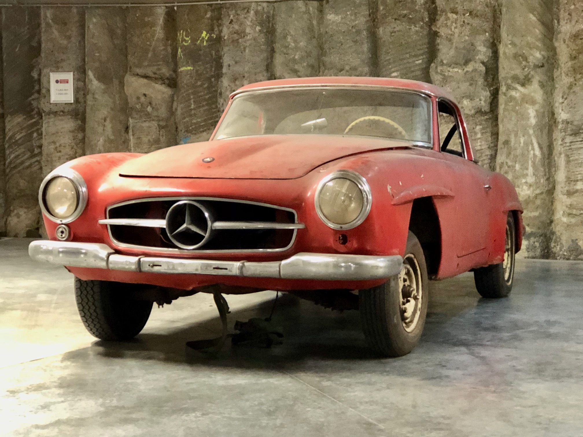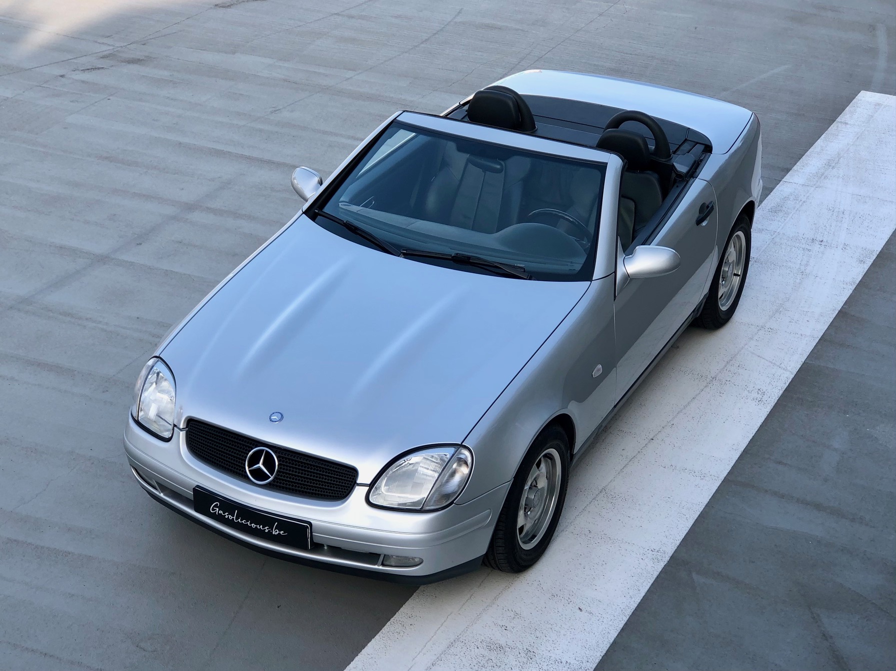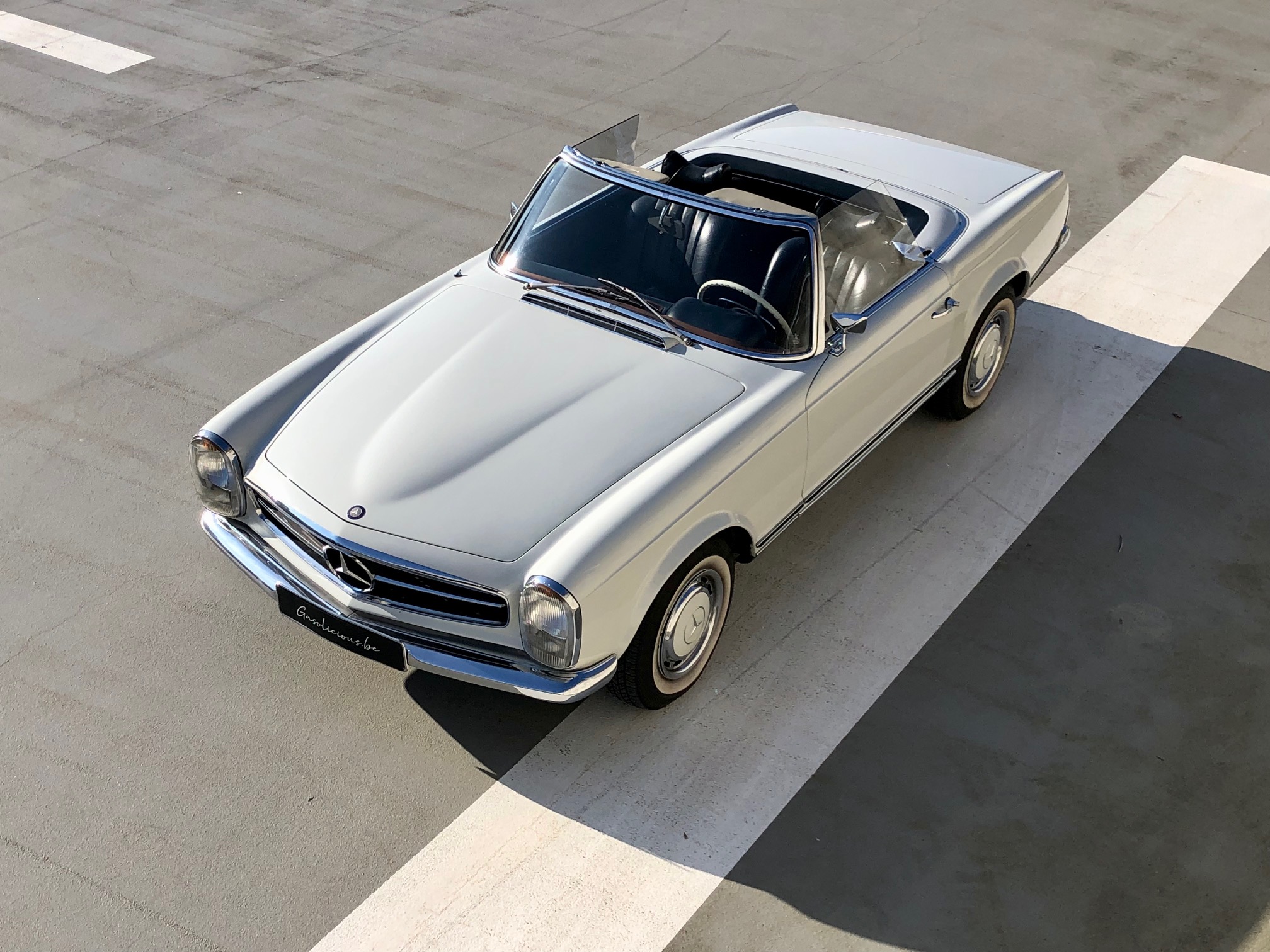 Our 230 model with a manual gearbox is distinguished by its configuration: Signalrot (568) paired with a cream fabric interior (055), a vintage combination, complemented by the electric sunroof.
