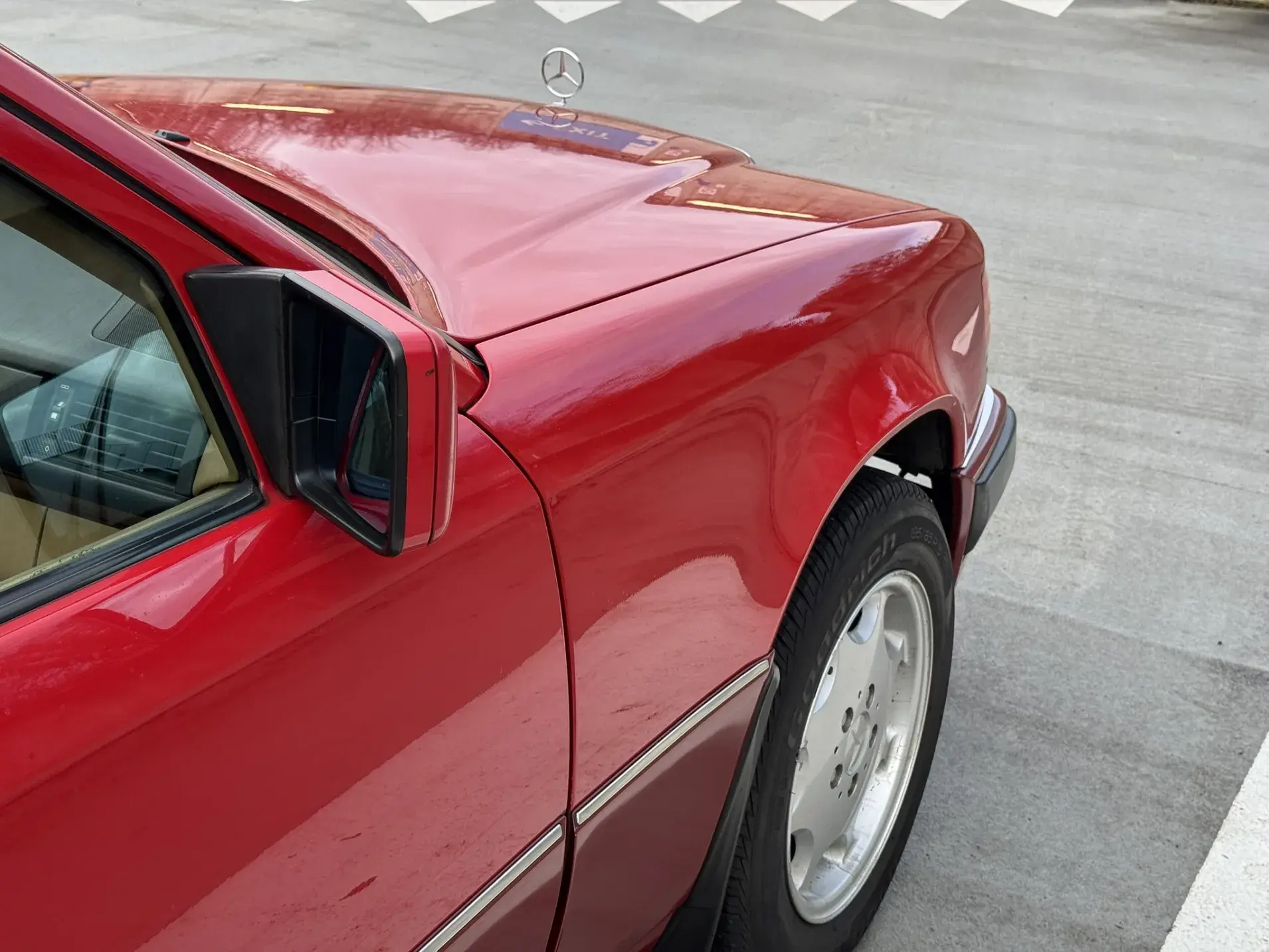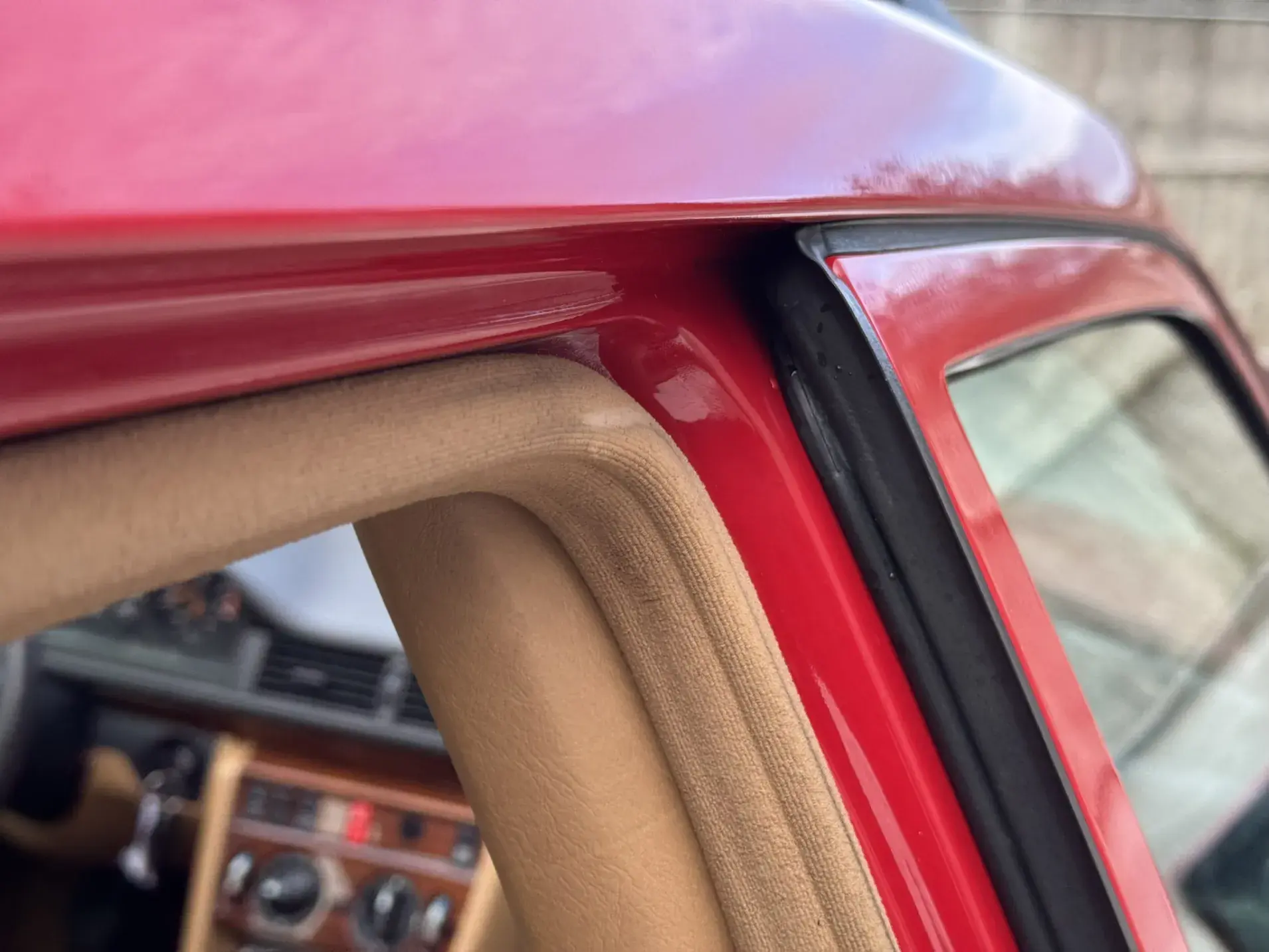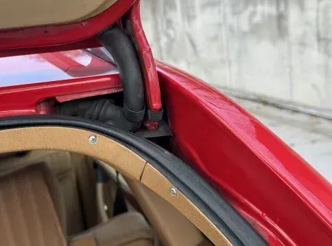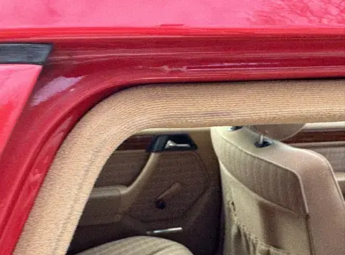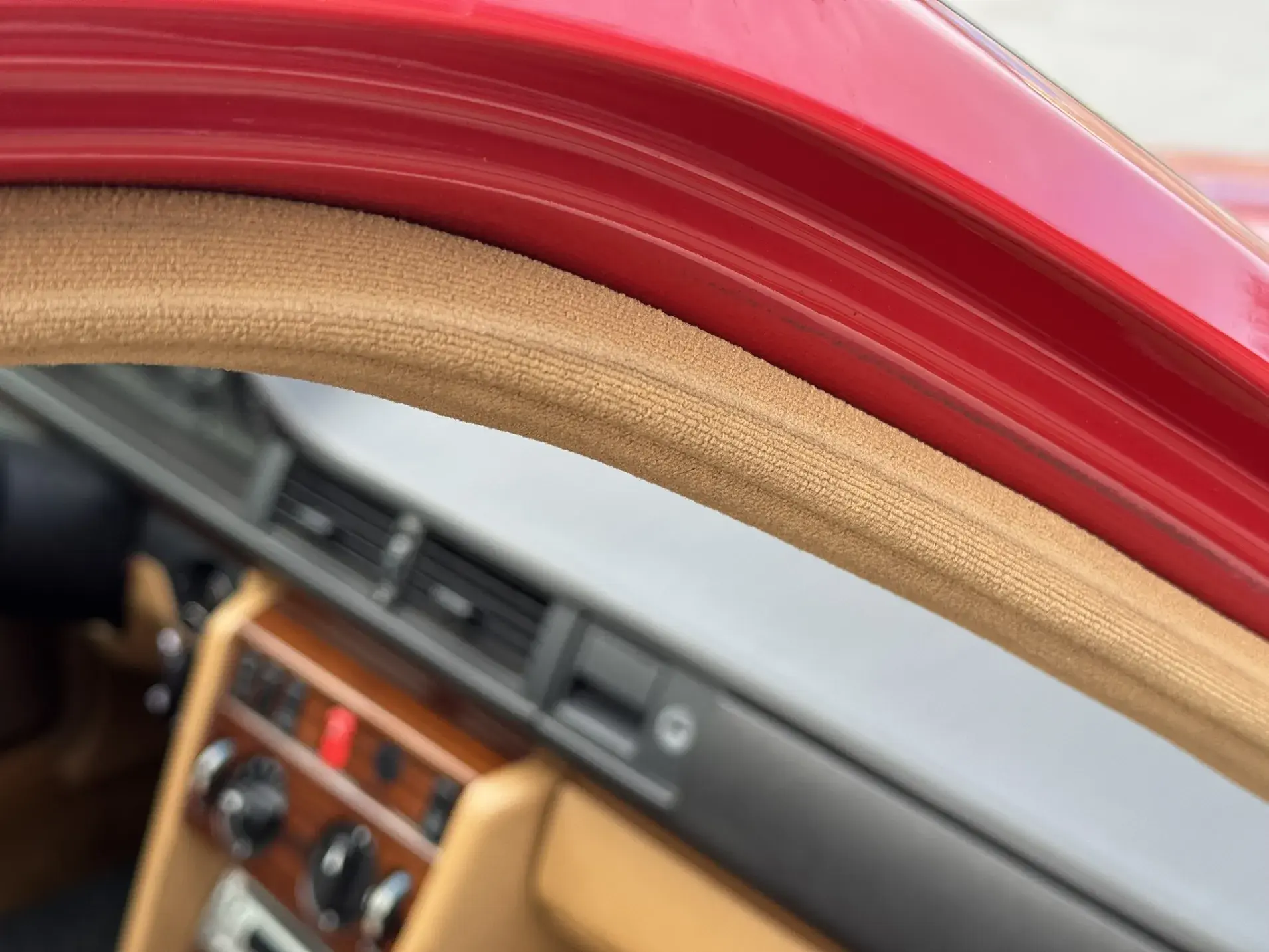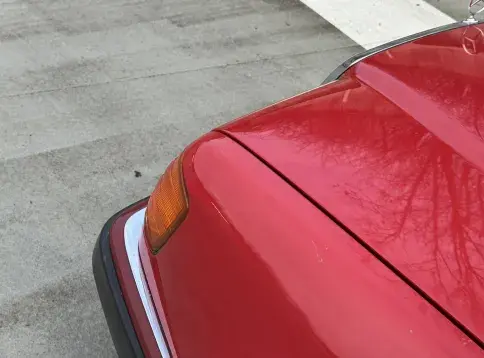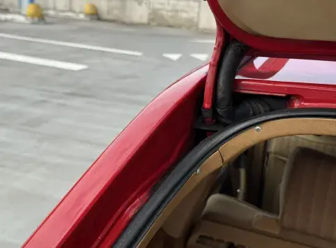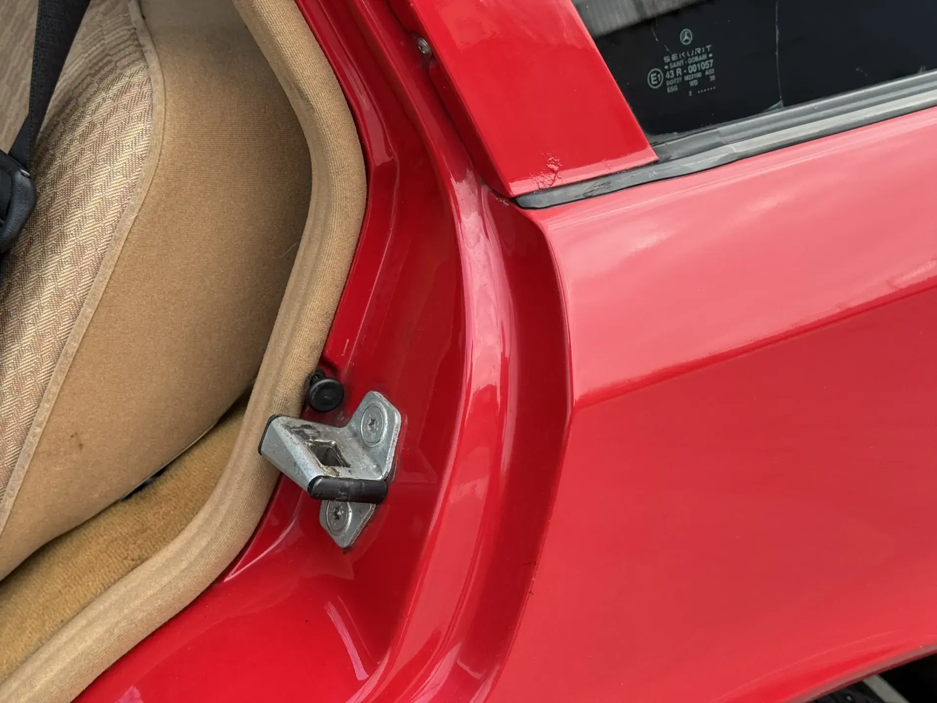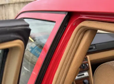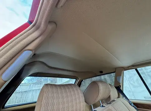 Notre exemplaire 230 à boîte manuelle se distingue par sa configuration : Signalrot (568) associé à un intérieur en tissus crème (055), une combinaison vintage, complétée par le toit ouvrant électrique.