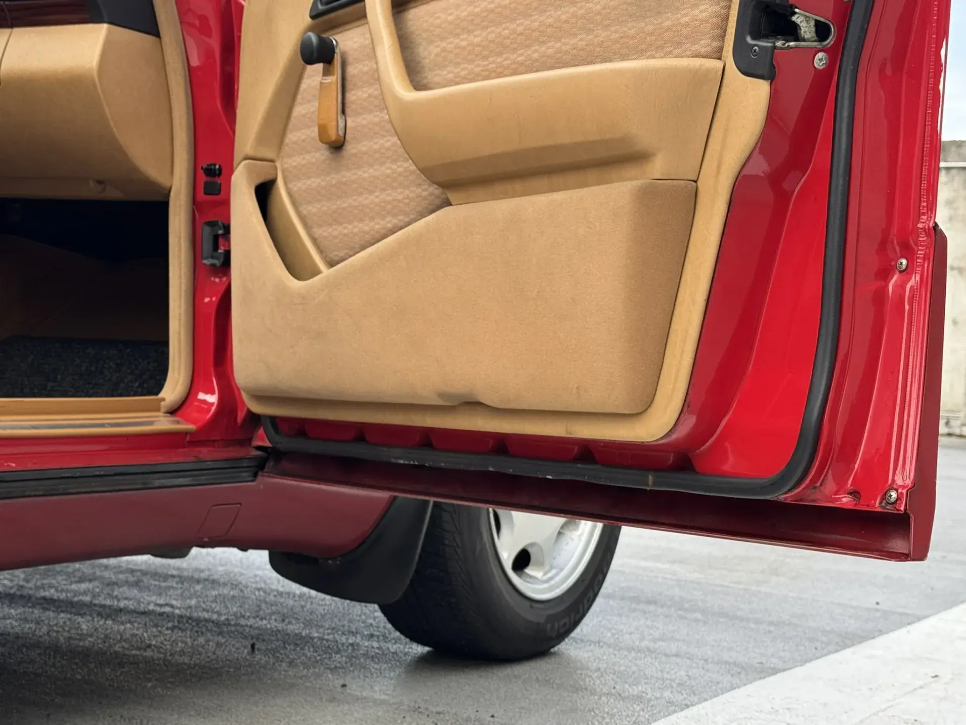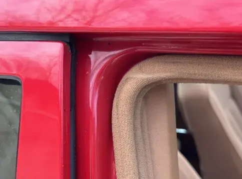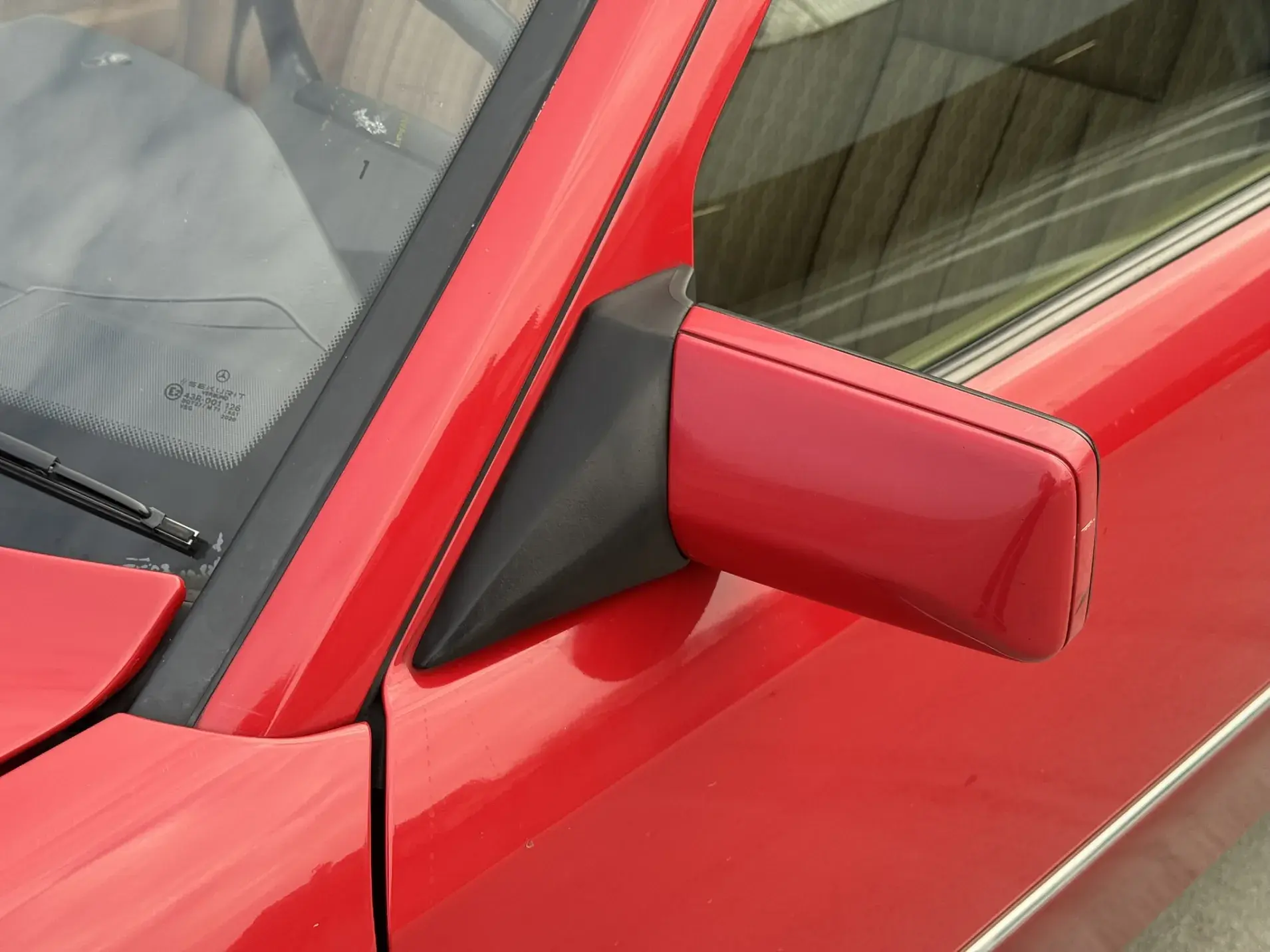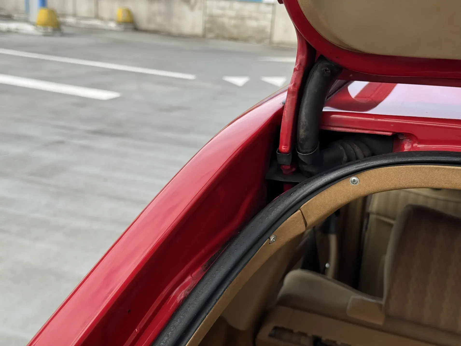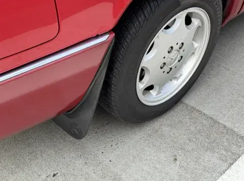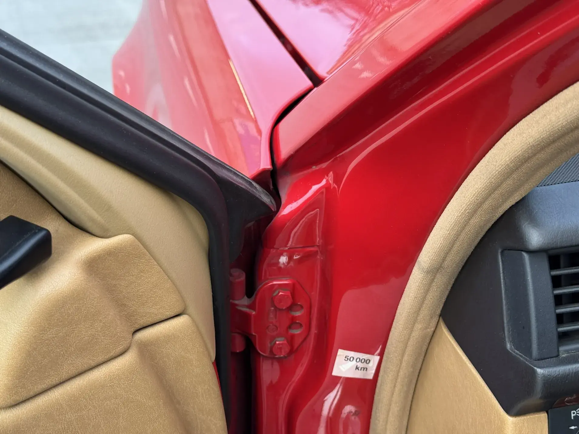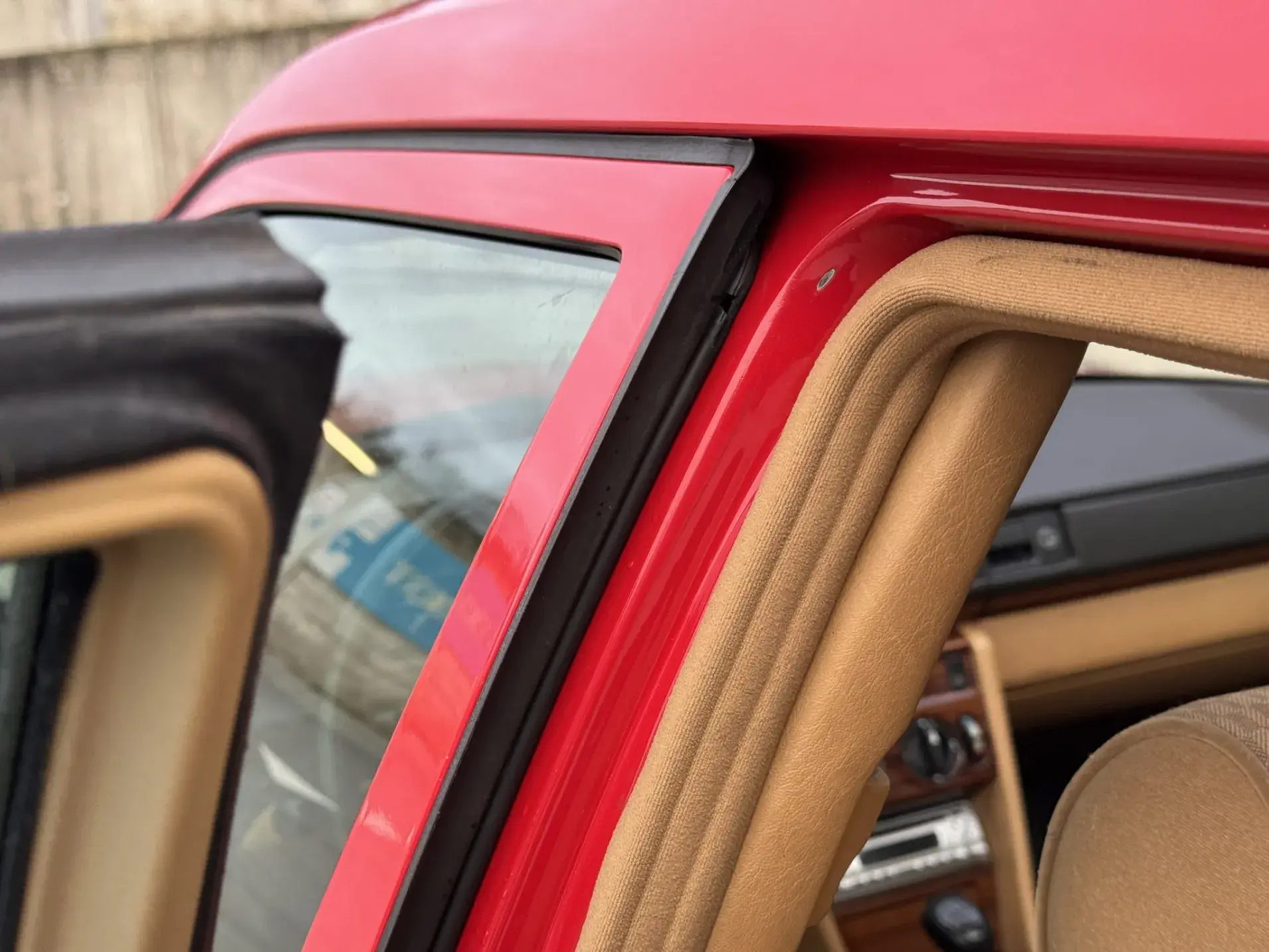 Notre exemplaire 230 à boîte manuelle se distingue par sa configuration : Signalrot (568) associé à un intérieur en tissus crème (055), une combinaison vintage, complétée par le toit ouvrant électrique.
