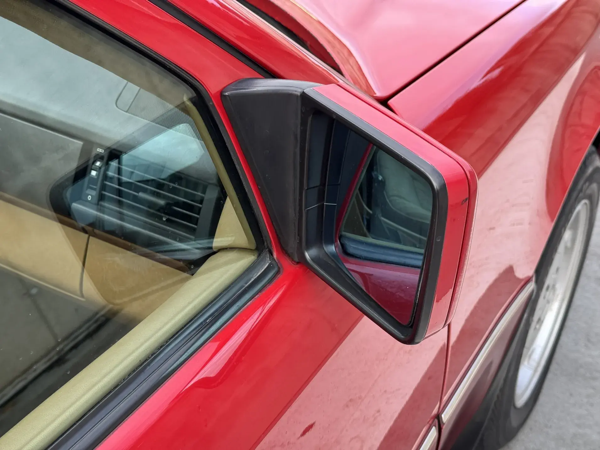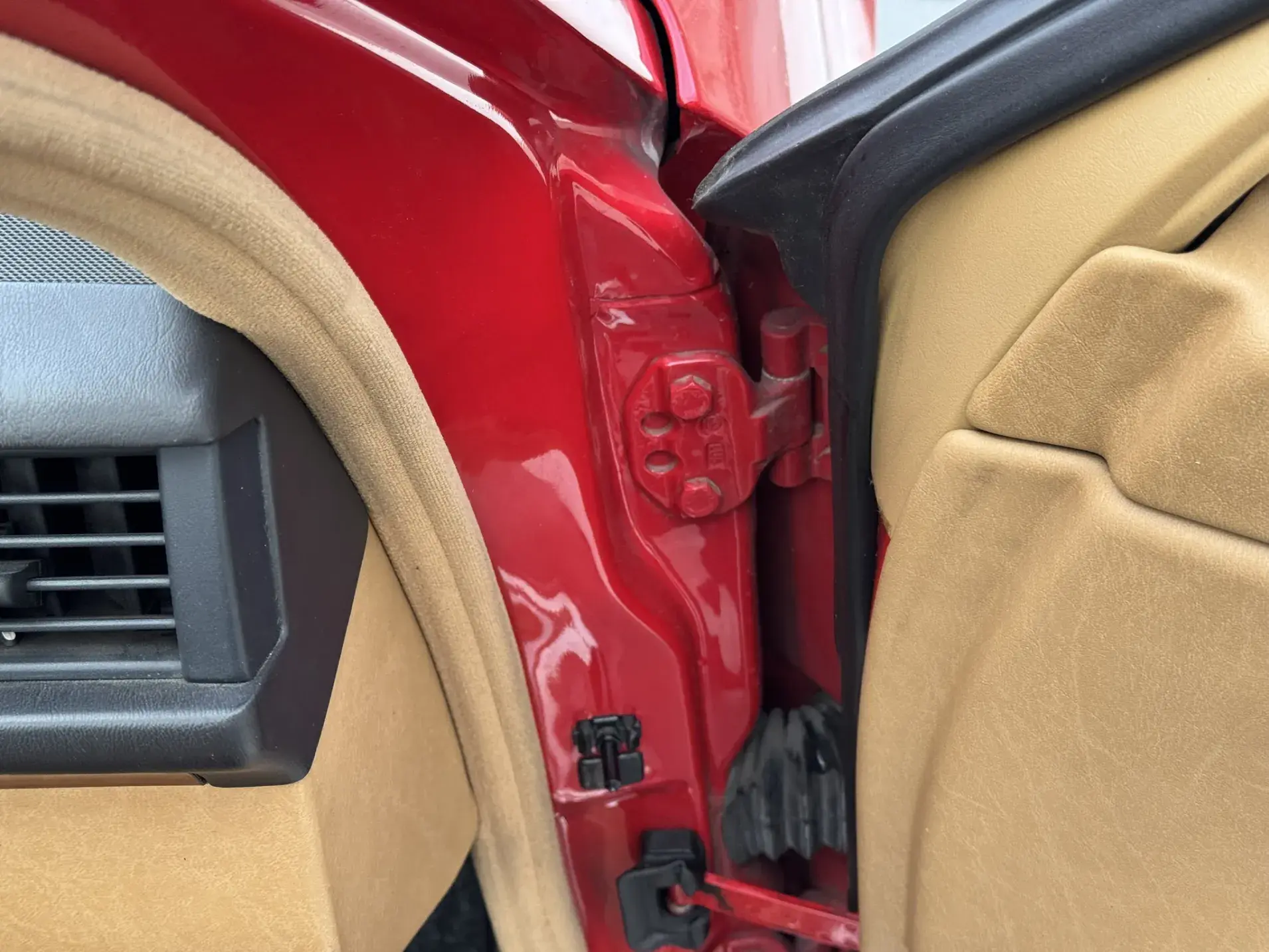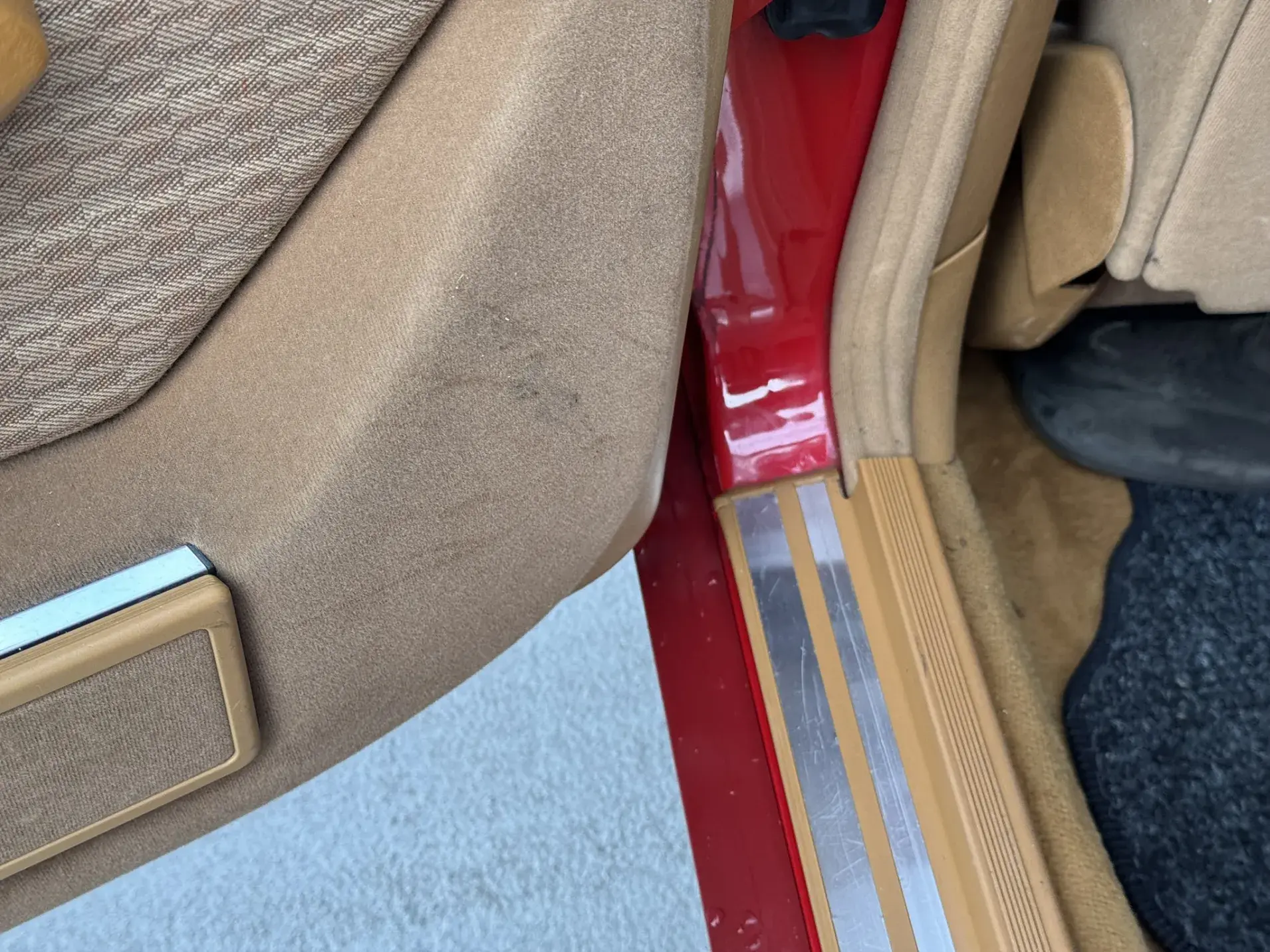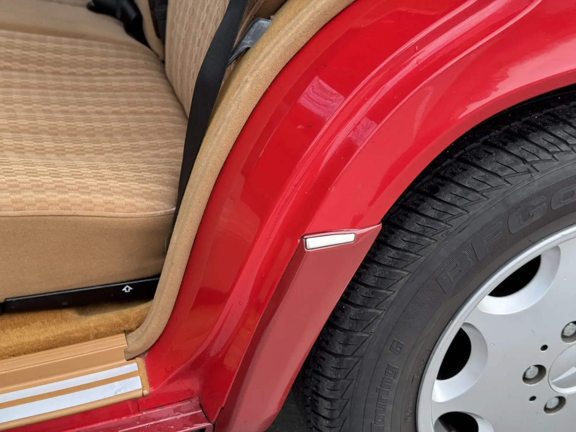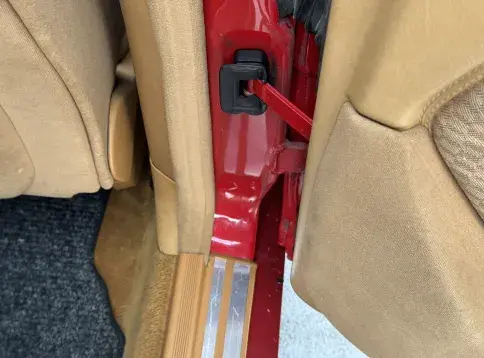 Notre exemplaire 230 à boîte manuelle se distingue par sa configuration : Signalrot (568) associé à un intérieur en tissus crème (055), une combinaison vintage, complétée par le toit ouvrant électrique.