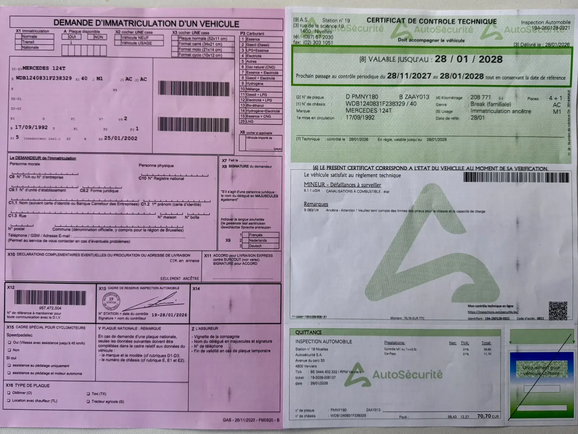 La voiture totalise 208.849 km, roule et se comporte parfaitement, et a passé le contrôle technique avec succès. Elle est prête à être immatriculée sous le statut ancêtre.