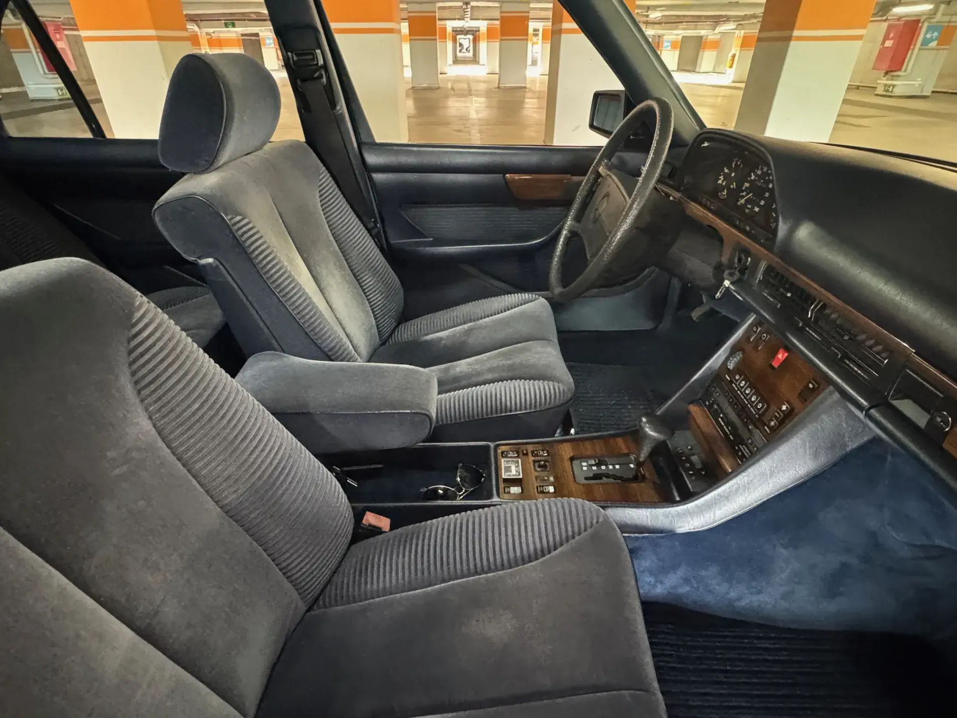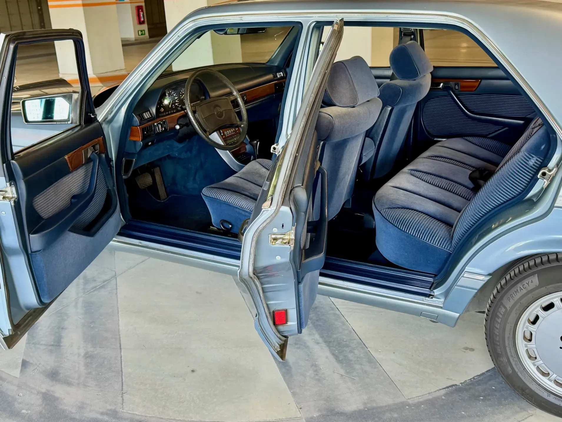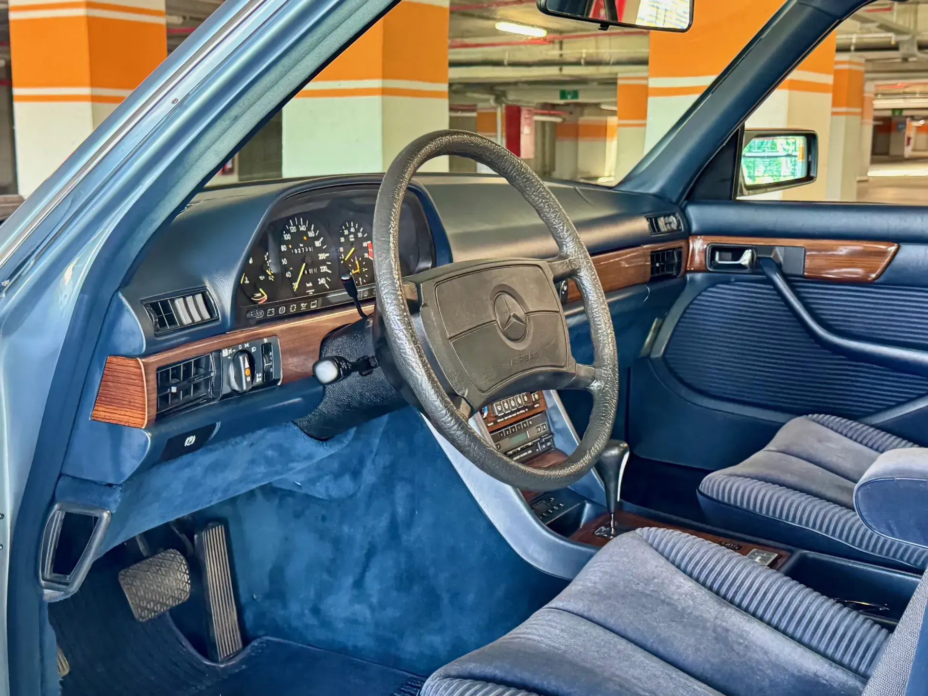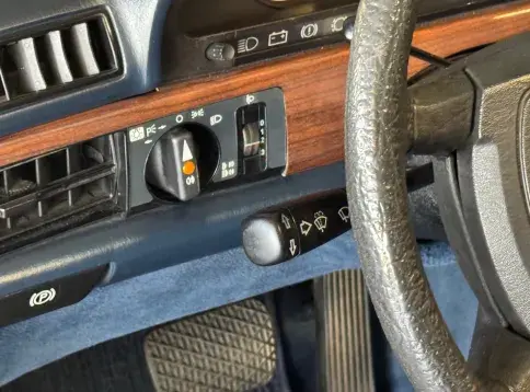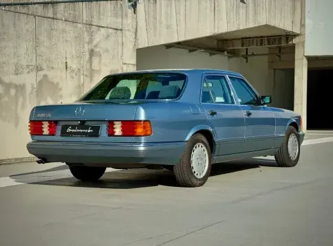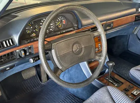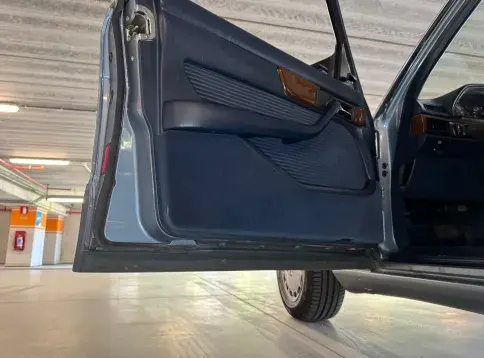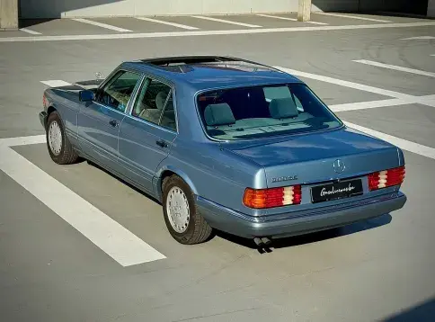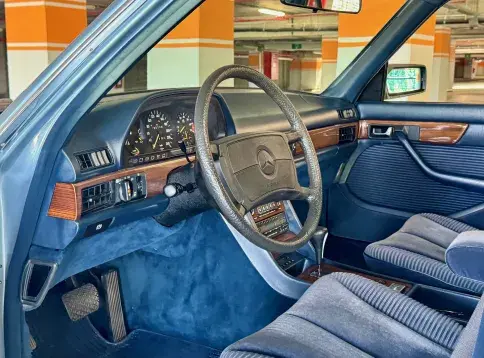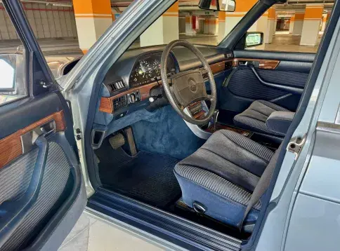 Notre Classe S W126 se distingue par une combinaison rare et élégante, dans un état d’origine très désirable. Diamantblau métallisé (code 355) et intérieur en velours bleu royal (code 972). L’ air conditionné est fonctionnel.