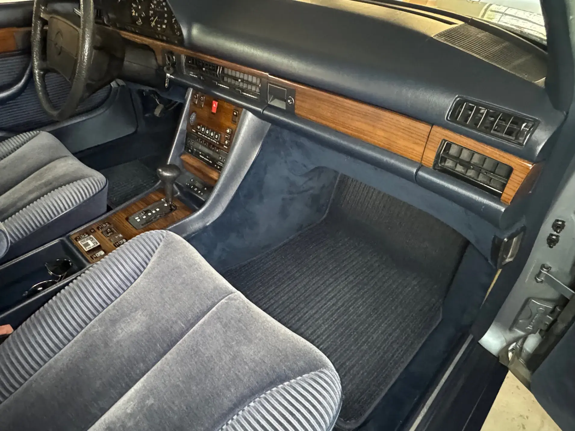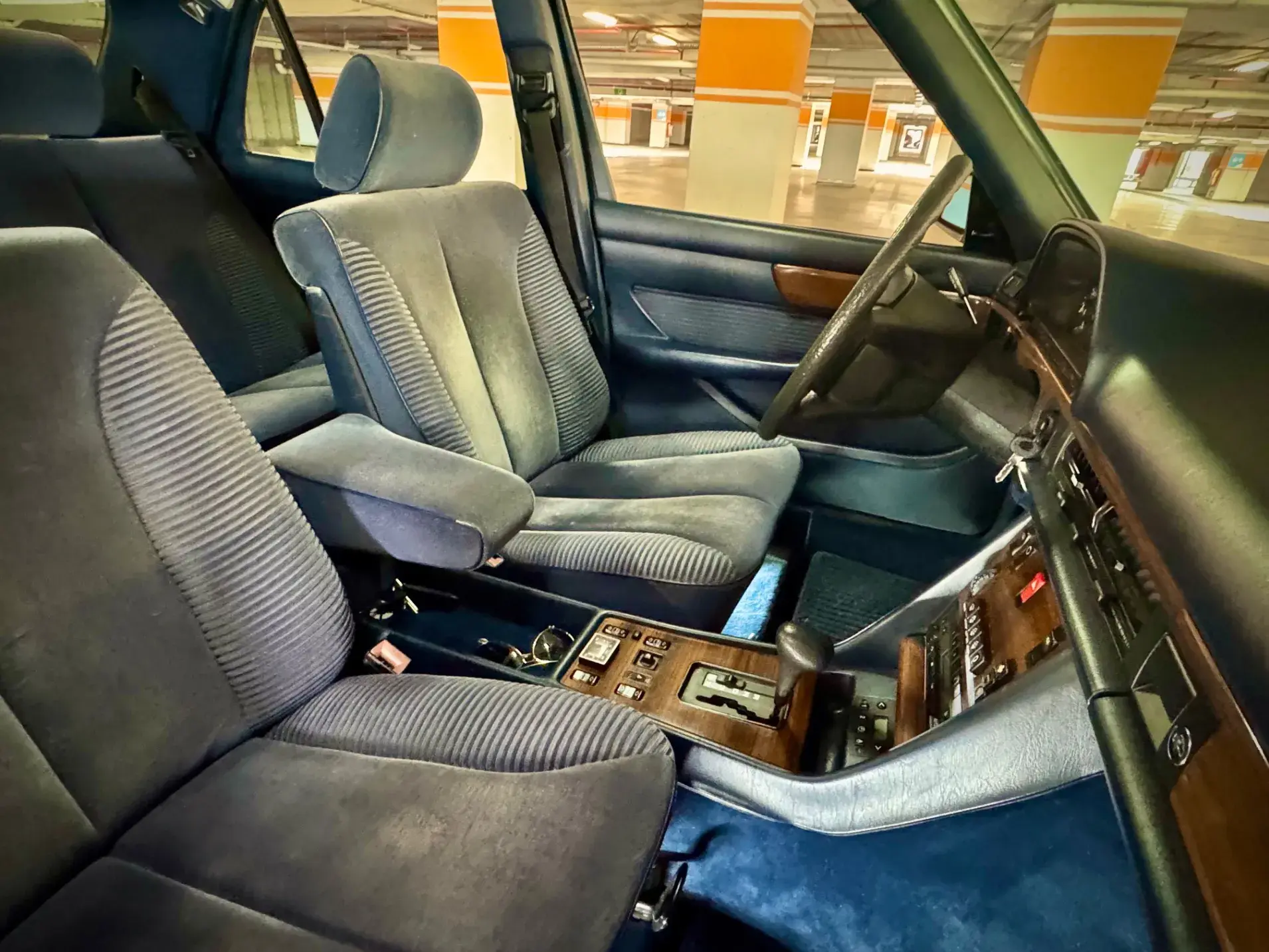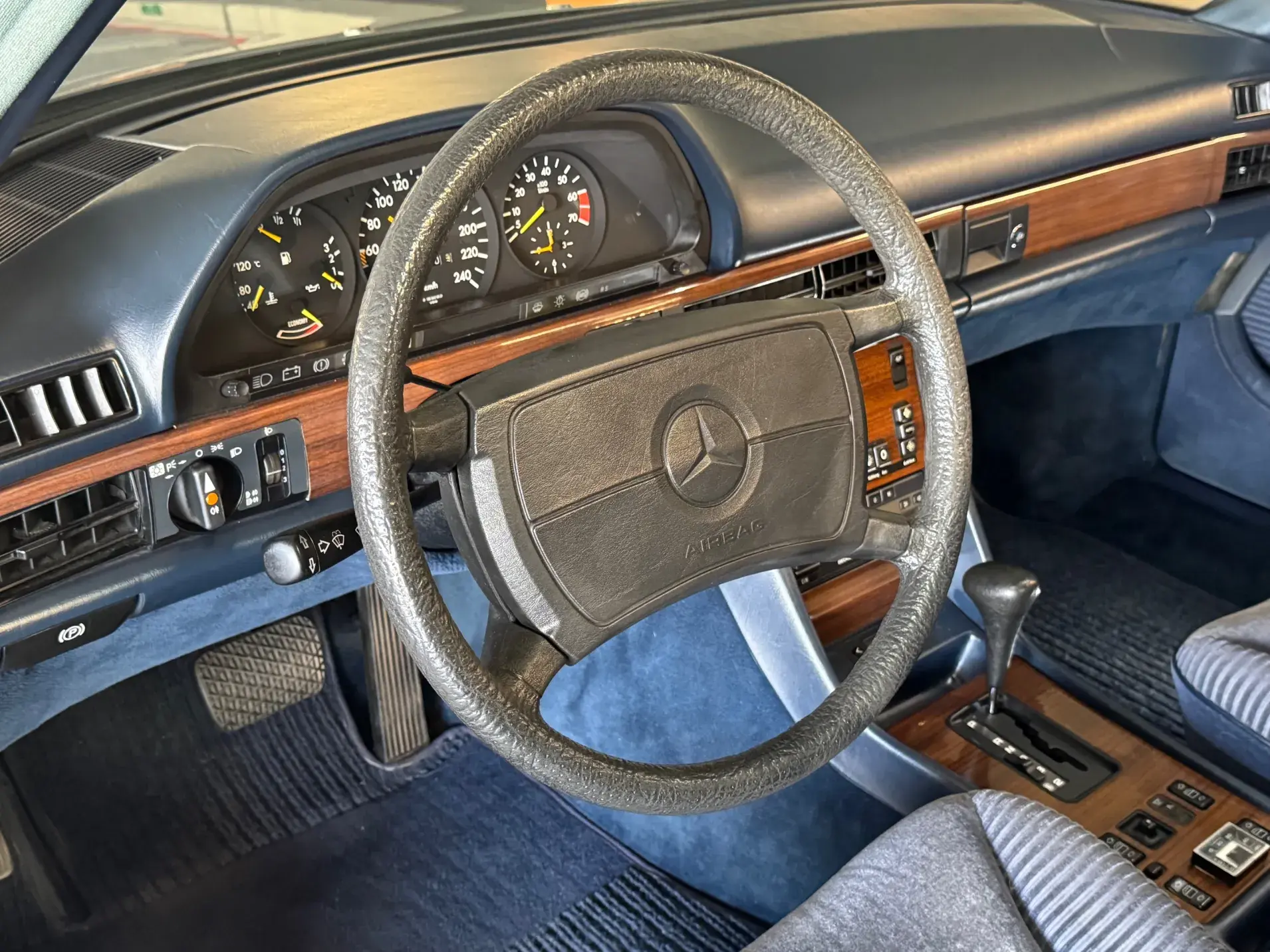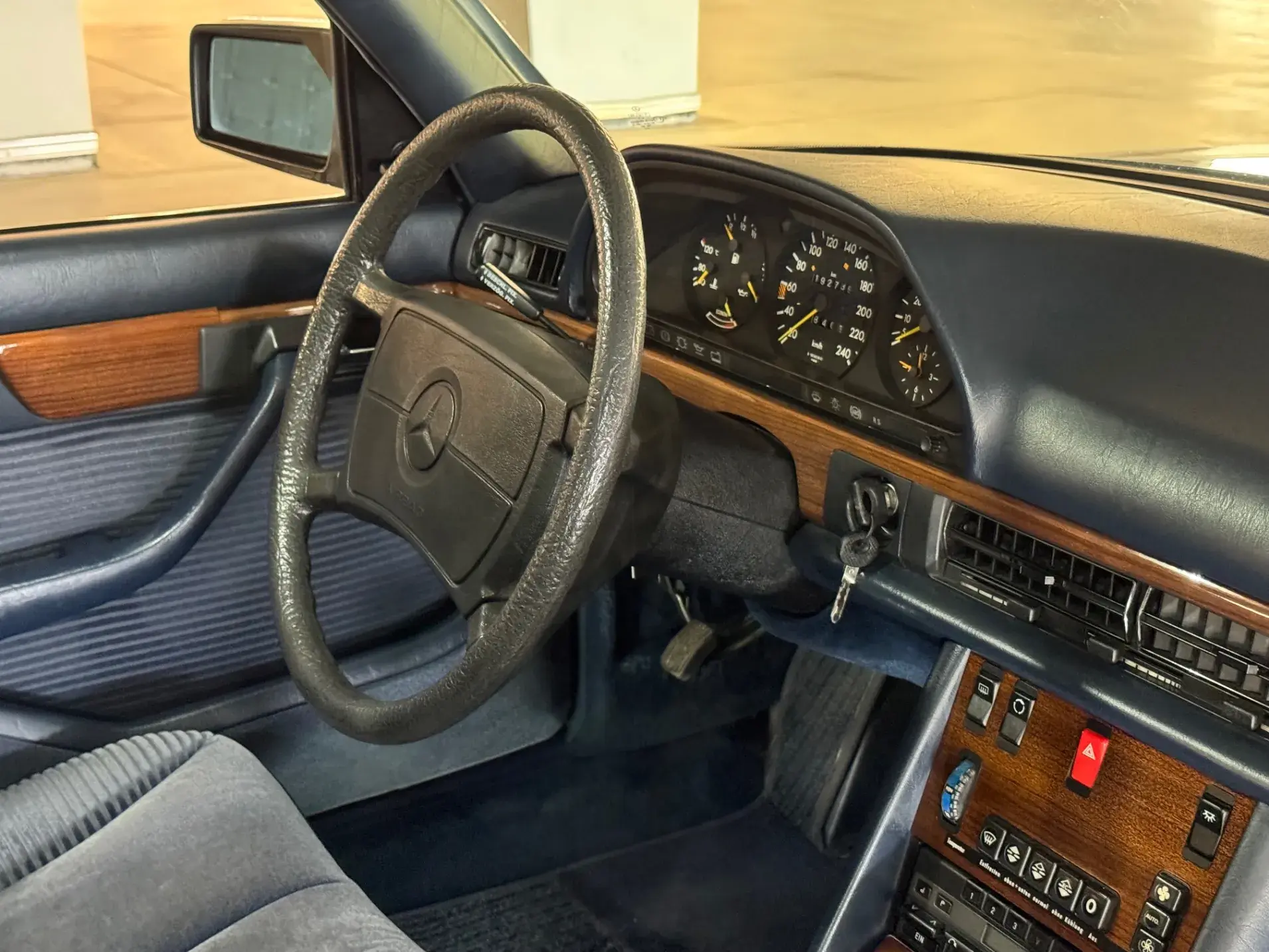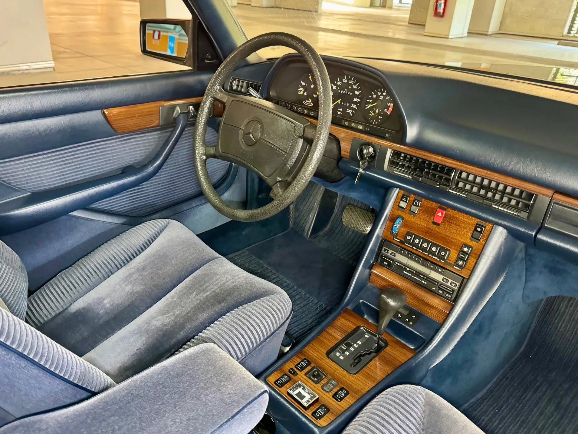 Notre Classe S W126 se distingue par une combinaison rare et élégante, dans un état d’origine très désirable. Diamantblau métallisé (code 355) et intérieur en velours bleu royal (code 972). L’ air conditionné est fonctionnel.