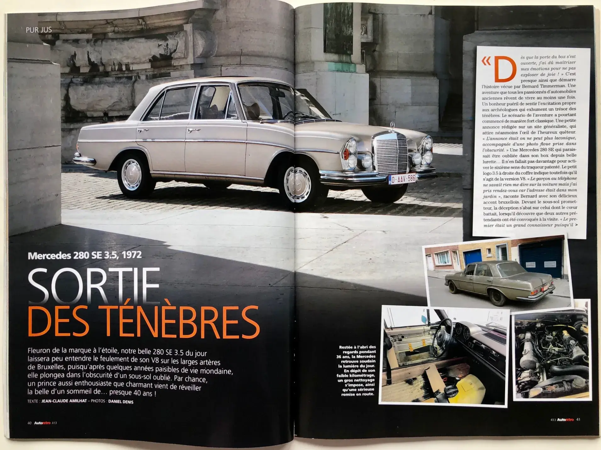 Un bonheur puéril de sentir l'excitation propre aux archéologues qui exhument un trésor des ténèbres. Le scénario de l'aventure a pourtant commencé de manière fort classique. Une petite annonce rédigée sur un site généraliste, qui attire néanmoins l'oeil de l'heureux quêteur. « L'annonce était cm ne peut plus laconique, accompagnée d'une photo floue prise dans l'obscurité. » Une Mercedes 280 SE qui parais-sait être oubliée dans son box depuis belle lurette...