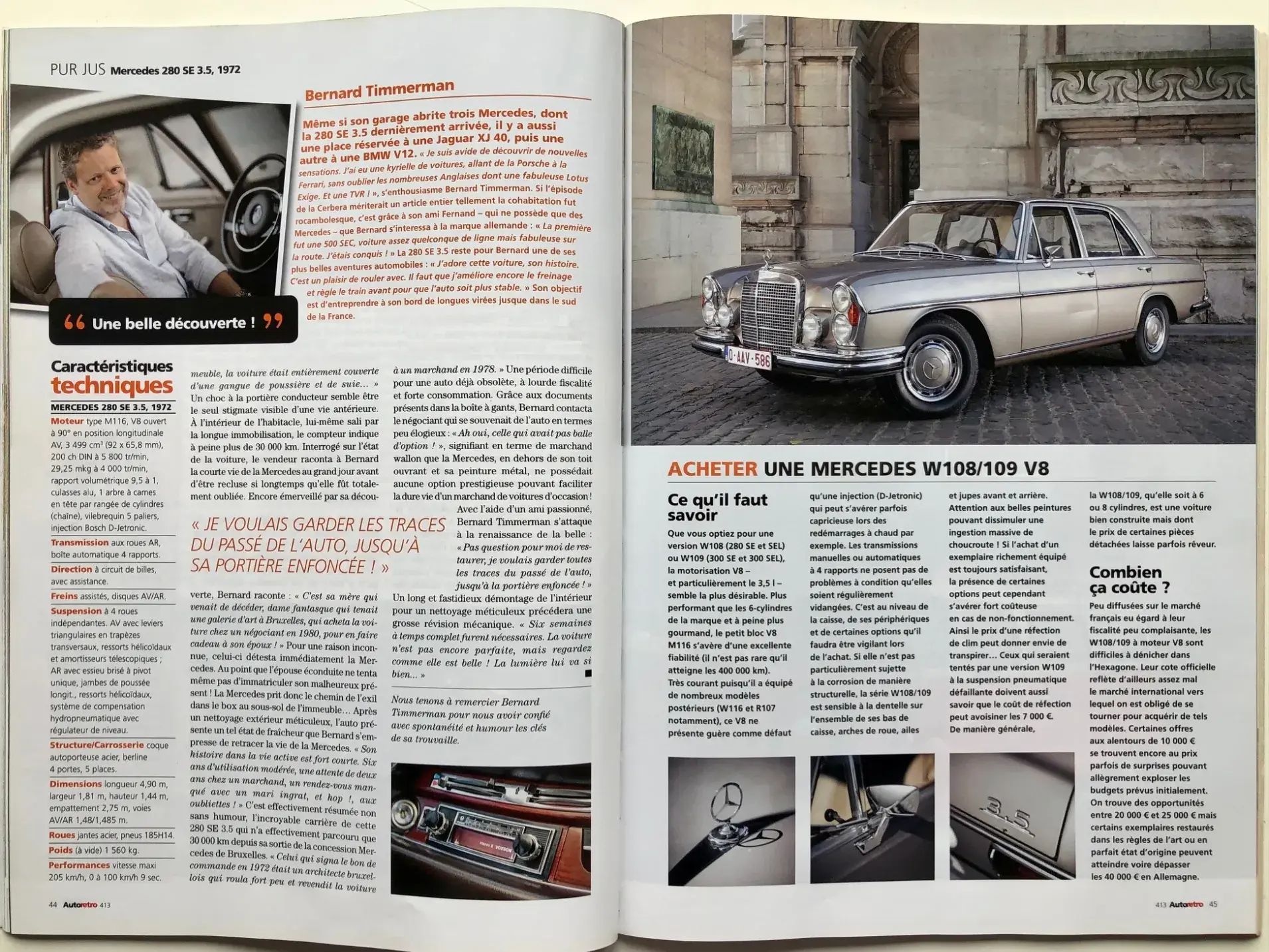 Après un nettoyage extérieur méticuleux, l'auto présente un tel état de fraîcheur que Bernard s'empresse de retracer la vie de la Mercedes. « Son histoire dans la vie active est fort courte. Six ans d'utilisation modérée, une attente de deux ans chez un marchand, un rendez-vous manqué avec un mari ingrat, et hop! aux oubliettes! » C'est effectivement résumée non sans humour, l'incroyable carrière de cette 280 SE 3.5 qui n'a effectivement parcouru que 30 000 km depuis sa sortie de la concession Mercedes de Bruxelles. « Celui qui signa le bon de commande en 1972 était un architecte bruxellois qui roula fort peu et revendit la voiture à un marchand en 1978. »